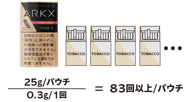 アークエックスは一袋に25gのタバコ葉が入り、喫煙一回分のタバコ葉使用量が0.3g前後、つまり一袋で83回分の喫煙となり紙巻きタバコ換算すると4箱分。